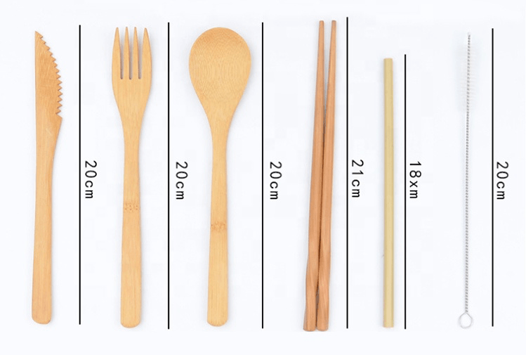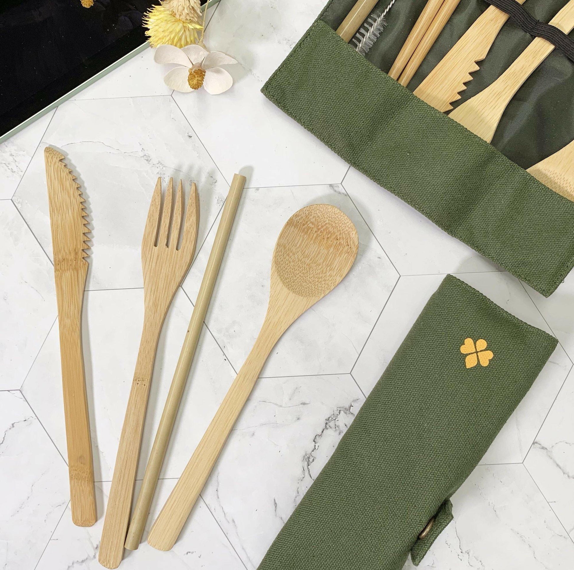 Help to save the environment by gifting our reusable bamboo cutlery set to a loved one! This bamboo cutlery set is light-weight and comes in a fabric green pouch with a metal clasp - the perfect size to bring around for lunches and picnics.