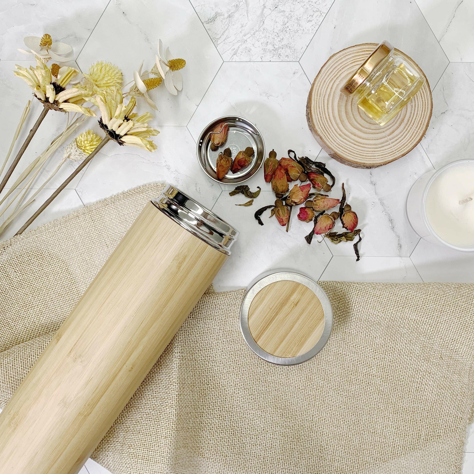 Get stylish with our unique bamboo tumbler. Engraved with our little honey bee logo, this bamboo tumbler comes with a food-grade stainless steel tea strainer. Perfect vessel to keep your beverage cold or hot for up to 12 hours.